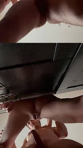 Screw on table, bottom view. Squirting climax and cum discharged.