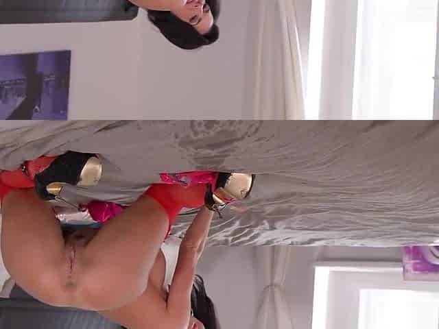 Having Fun with a Huge Dildo in Lingerie, Stockings, and High Heels