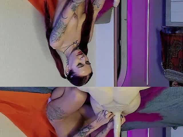 Tattooed Bubblez with small tits playing with a big pink dildo