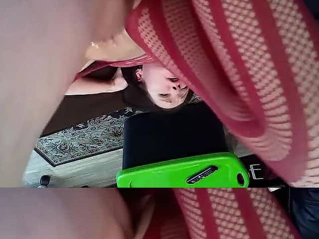 Trashy porn slut in fishnet stockings pokes her twat with big dildo