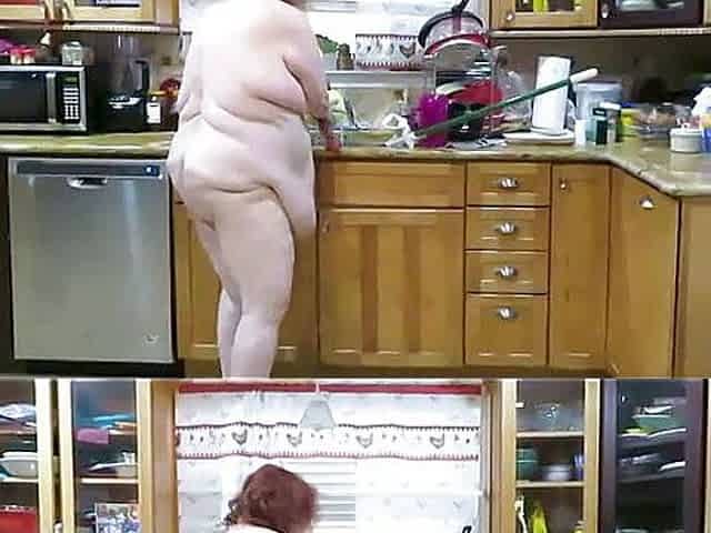 BBW nurse vicki wiping up the wet soapy floor then playing with a huge dildo and sponge while talking to the naughty boys