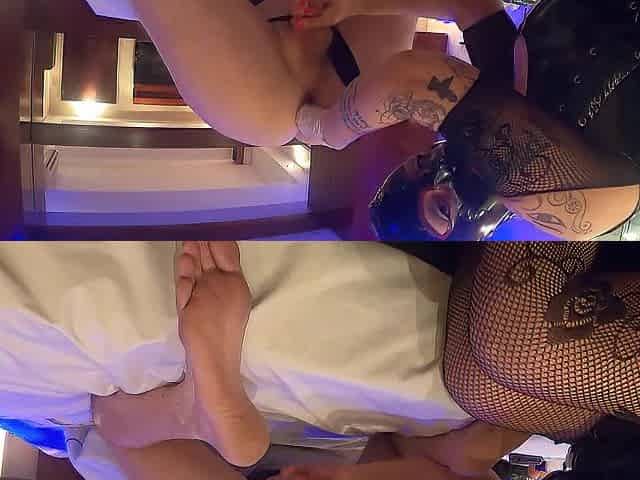 Bitch Rides A Big Black Dildo And Does A Footjob Then Fucks A Small Ass With A Toy And Cums P1