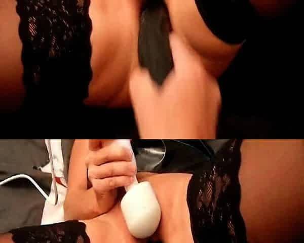 Brunette in a sexy black outfit is using a big dildo for pussy stuffing