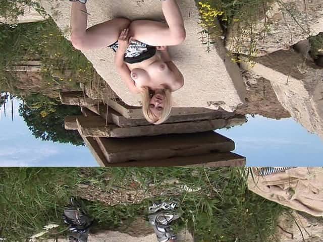 Blonde with nice ass yelling as she screws her shaved pussy using huge dildo