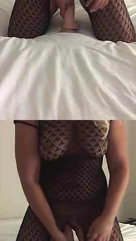 Horny Milf fucks big black dildo in slutty fishnets and heels