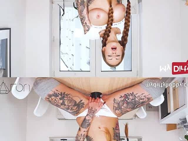 Lovely Tattooed Babe Smashes Rides a Big White Dildo