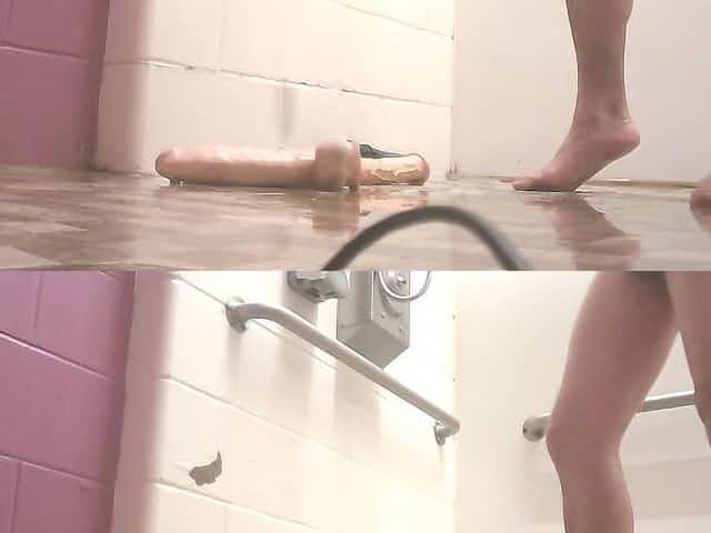 taking a huge 14 inch dildo up the ass in a public bathroom while taking a shower