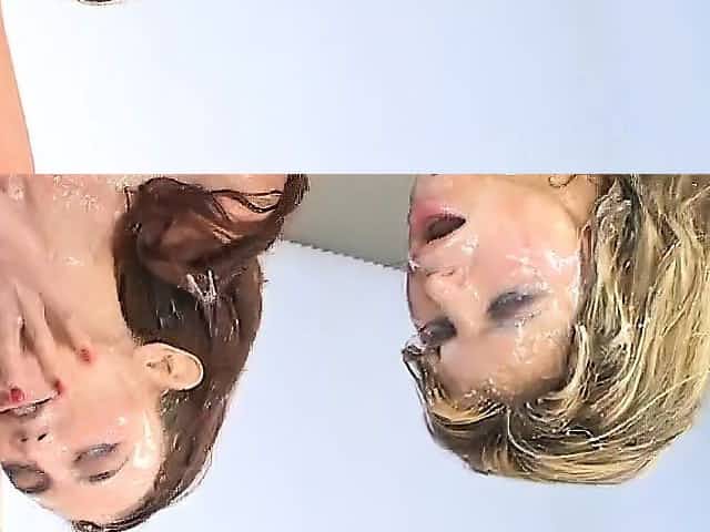 Blonde and brunette lesbians sharing a big dildo