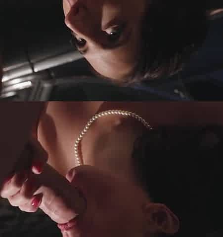 Dark haired horny hooker plays with her juicy natural melons on POV camera