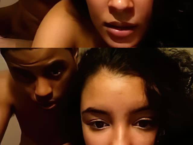 Attractive caramel girl shows off her huge natural boobs and sucks a black cock