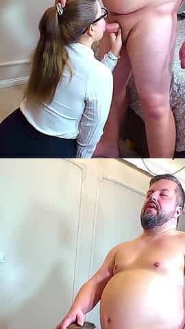Employee Services Her Boss at His Desk