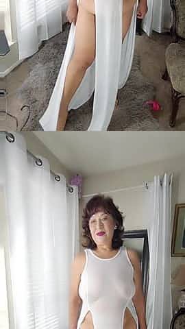 I love my aged bushy cunt, thighs, bazookas, & booty watched as I shake & wiggle in my transparent night gown