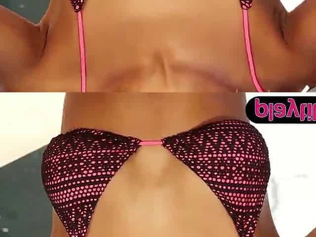 Breasty tiny pretty black hottie disrobes stripped by the pool outdoors