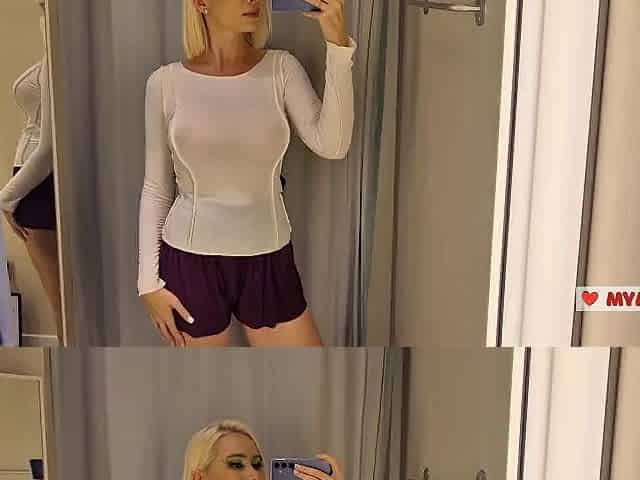 Trying on completely transparent clothes in the fitting room. Look at my boobs in a public place