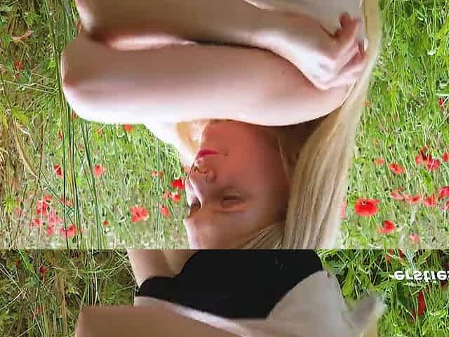 1st-year biker Katja E relaxes on the meadow with sex tool and booty-plug