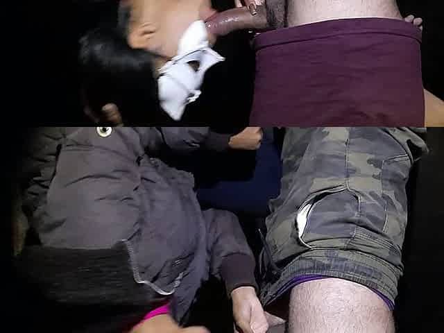 Lucky biker guy eats tiny brunette's wet deep tight pussy outside