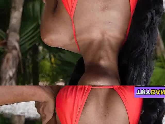 Sweetheart with a large butt sticking her booty out in a mini bikini stuck in her booty