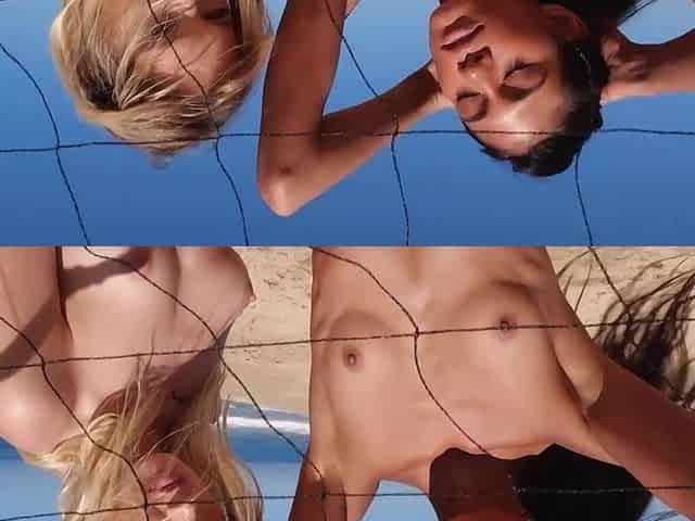 Lesbian girlfriends Hannah Le and Kylie Belle play volleyball on the beach