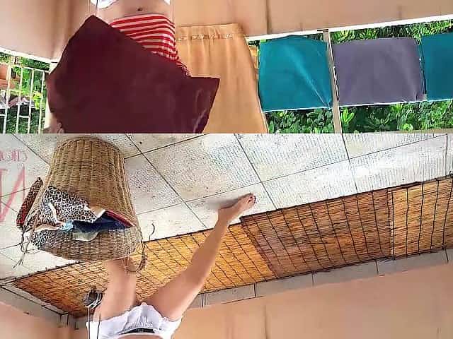 The Naive Housewife Hangs up the Washed Laundry. there was a Free Space on the Rope, the Doxy took
