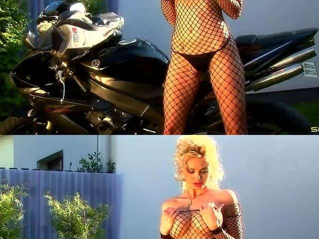 Big tits bimbo in fishnets makes the motorcycle look sexy
