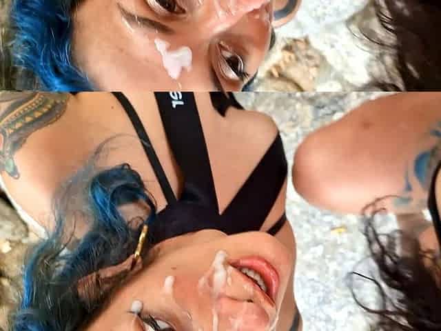 Horny teenager Asian bi-atch gargles manmeat in threesome, creampied and cummed on!