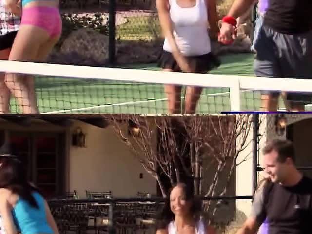 Two big dick guys fuck the tight holes on two brunette bisexual sluts