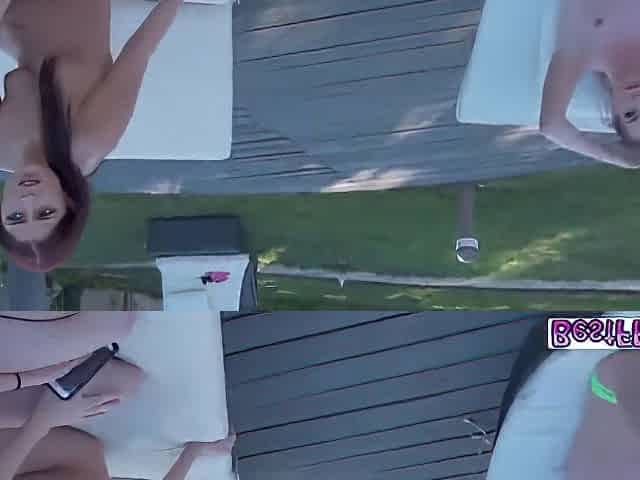 Two slutty sexy bitches share a cock in a threesome in POV video