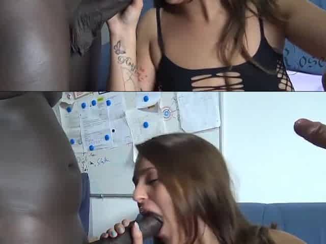 Nice tits black bitch sucking and fucking a black dong after shaving her pussy