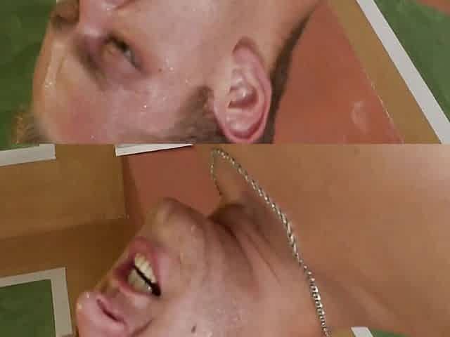 Bitch swallows massive cum after sucking and riding two huge cocks