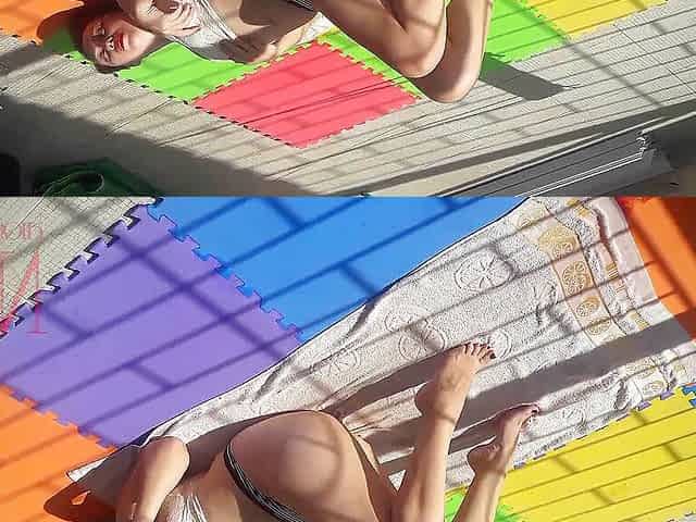The bitch spreads her legs, shows a meaty juicy pussy. Slut teases with her flexible sexy body.