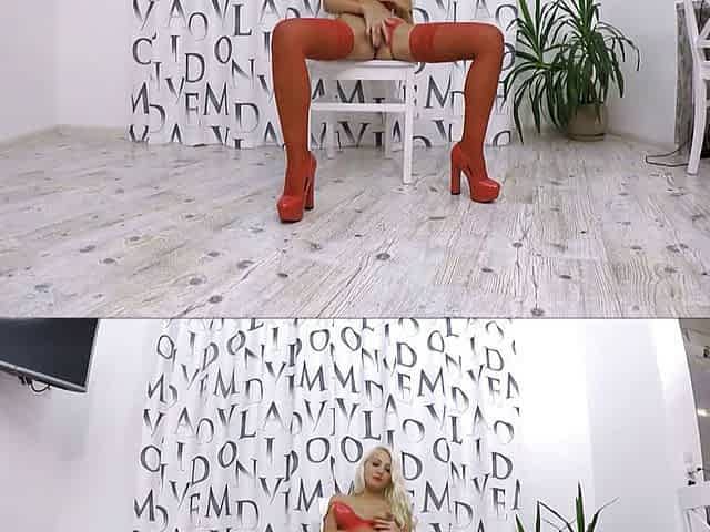 Blonde bitch Silvie gets fucked in red stockings