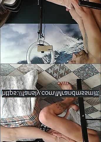 Russian bitch groans from climax and strong jizz flow on her legs in nylons