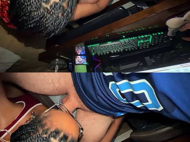 BIG TITS Black girl SUCKS white cock while he works