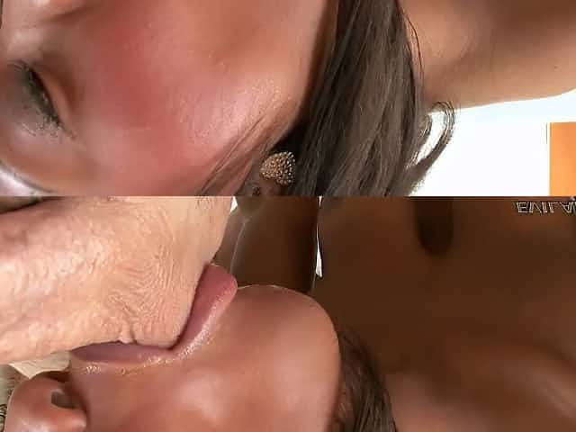 Ebony hottie Sarah Banks sucks big white dick and rides it face to face