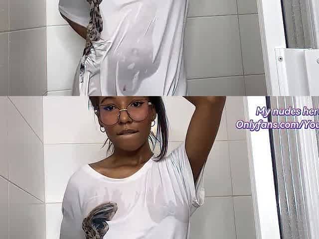 Her teats and booty are visible throughout a soaked T-shirt with blameless black teen