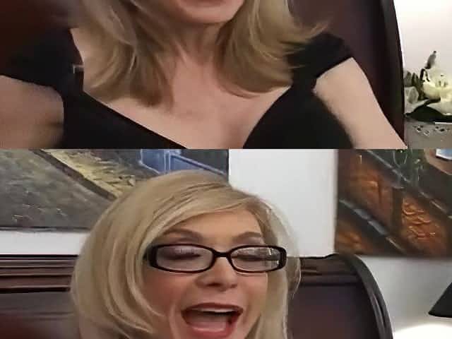 Aged blond woman with ebony glasses, Nina Hartley is giving a unfathomable oral job to Joe