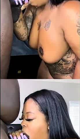 "Chubby black bitch getting dick in her mouth and cunt and cum on face"