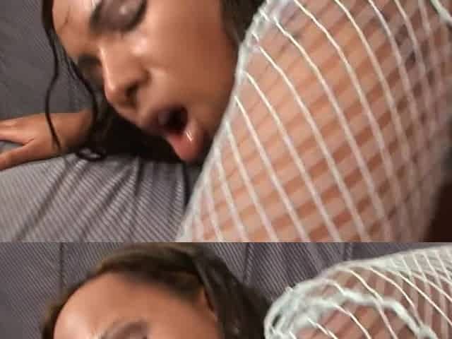 Dark ebony rump biotch in fishnets gets fucked for deep cootchie penetration by black stud
