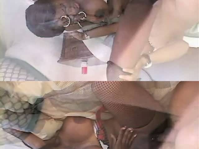 Slender ebony milf in sexy lingerie has a black guy banging her holes