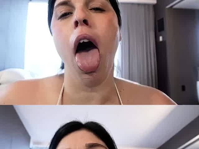 Busty brunette sucks and licks big cock in a close up