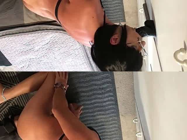 Brunette ladyboy in black bikini strokes her hairy cock on