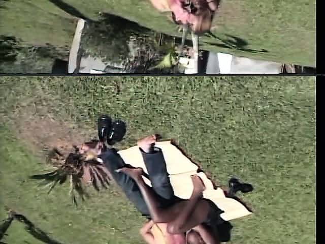 In the garden, a black shemale with big boobs slides a white cock down her throat