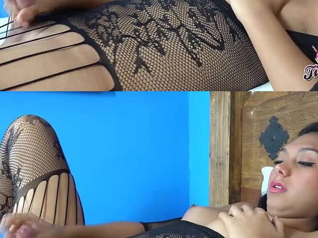Ass fingering ebony shemale gives blowjob and handjob in POV
