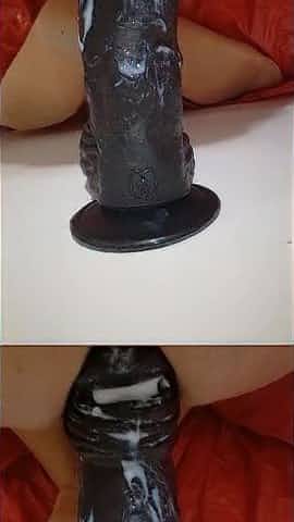 Naughty ebony t-girl strokes her extreme black mamba shecock