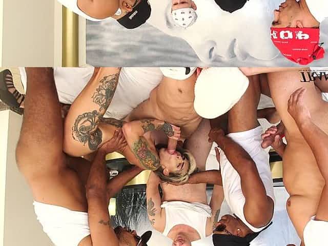 Crowd of big black guys fuck anal hole of tattooed tranny Gaby Ink