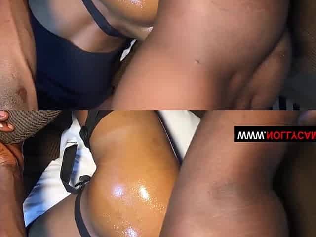 Nude Resort Threesome – She Oils Up and Takes Two Big Dicks!