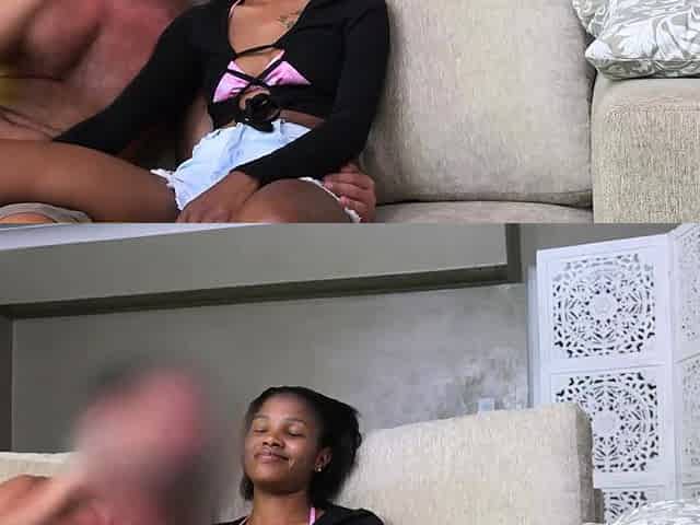Horny young ebony with pigtails gets to taste a black and white cock on the sofa