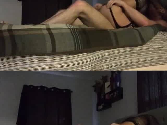 Blindfolded brunette hair is sucking a large, ebony weenie and getting stuffed with it, on the bed