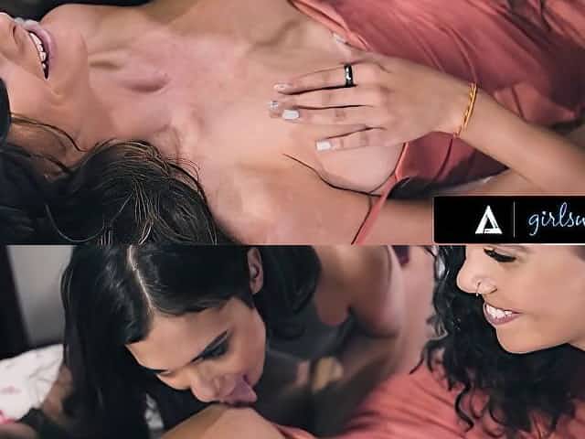 Brunette lesbian pleasures her blindfolded girl and sucks tittys