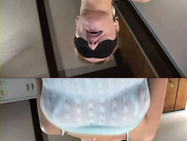 Topless and blindfolded, this Asian slut masturbates then sucks cock POV